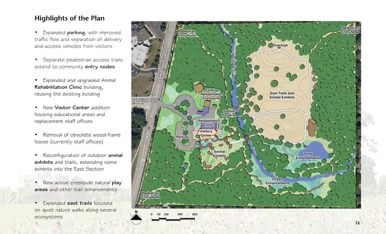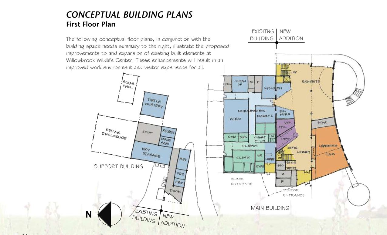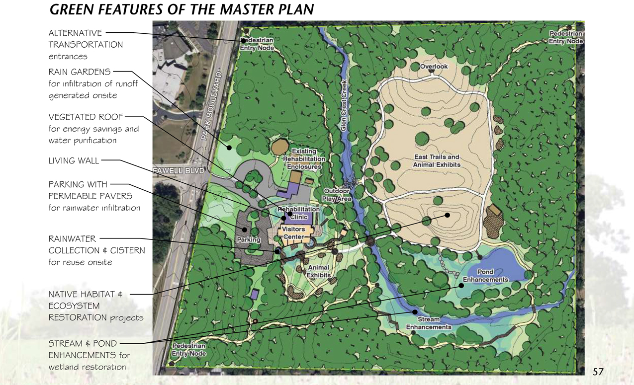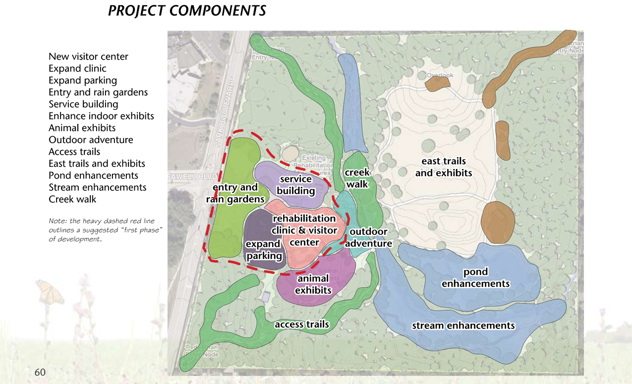The following are exerpts from a long-range plan I produced for the development of the physical facilities including visitor center, animal care buildings, trails, wetlands, water features, animal exhibits and public educational content.