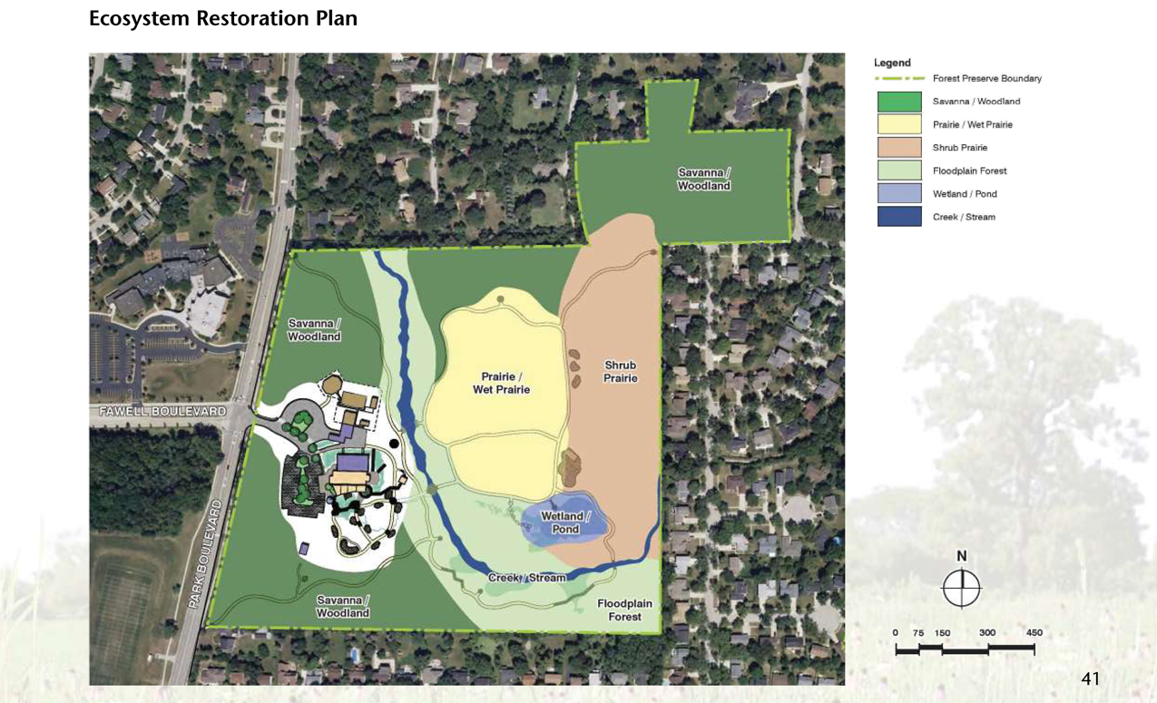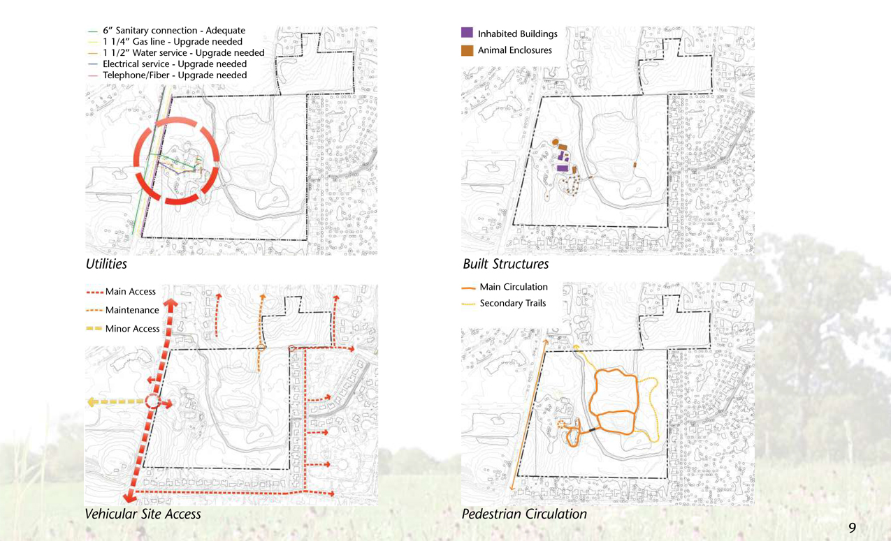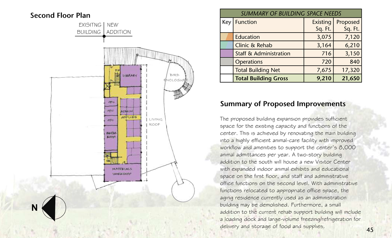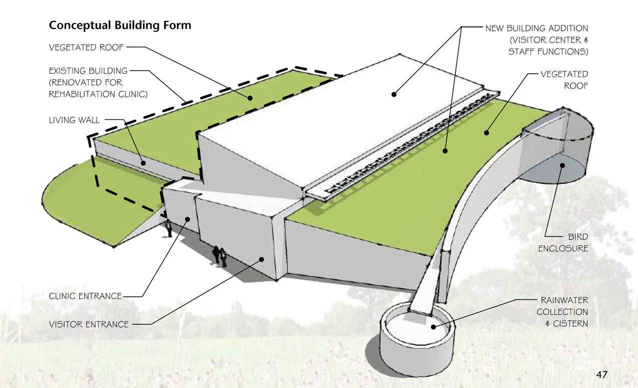 The following are exerpts from a long-range plan I produced for the development of the physical facilities including visitor center, animal care buildings, trails, wetlands, water features, animal exhibits and public educational content.