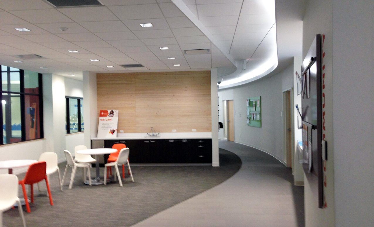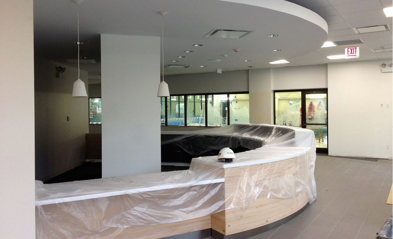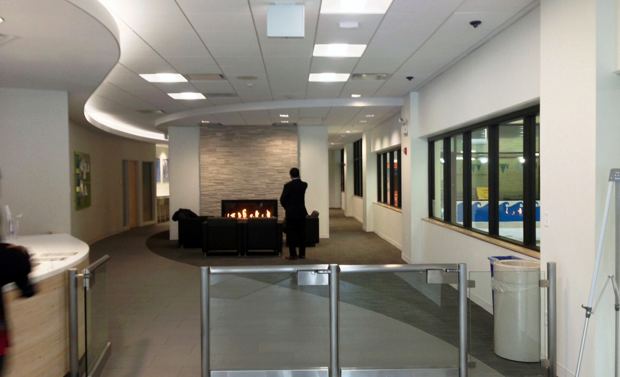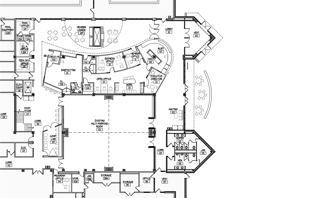 This 3-phase building renovation project with the result of a involved masterplanning process including member and community input. I was the primary client contact and advisor from design through construction, developing the design documents and ensuring quality throughout all phases of construction. Renovations included a reconfigured entryway and exterior facelift for better visibility, and interior reconfiguration for more transparent and welcoming community and staff areas, updated locker rooms, new hydrotherapy pool, and new fitness/spin/yoga studio.